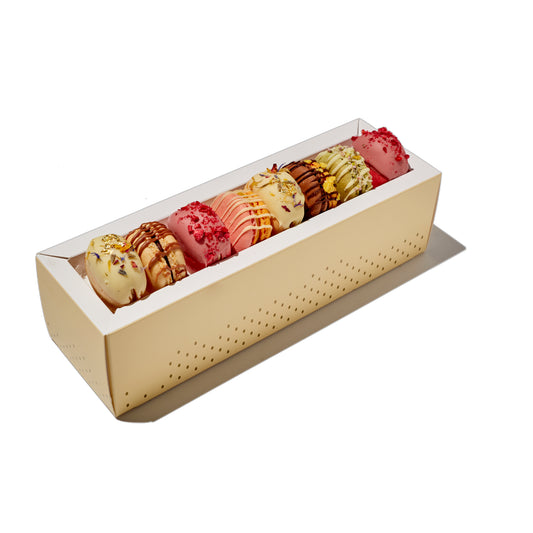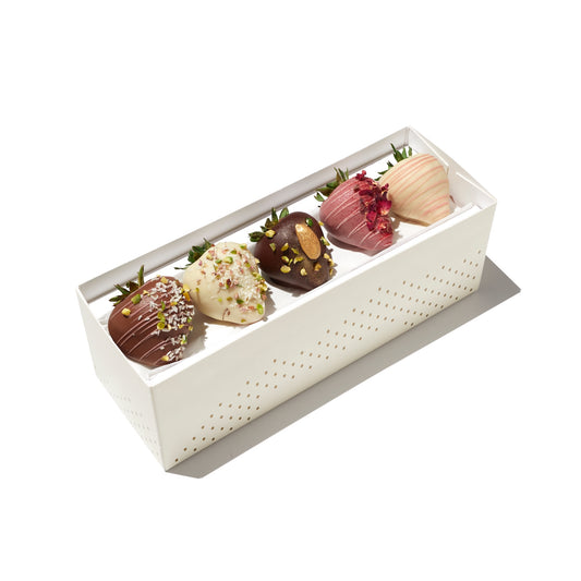 Mini Box mit dekorierte Erdbeeren in Zartbitter-, Milch-, Weißer- und Ruby*-Schokolade